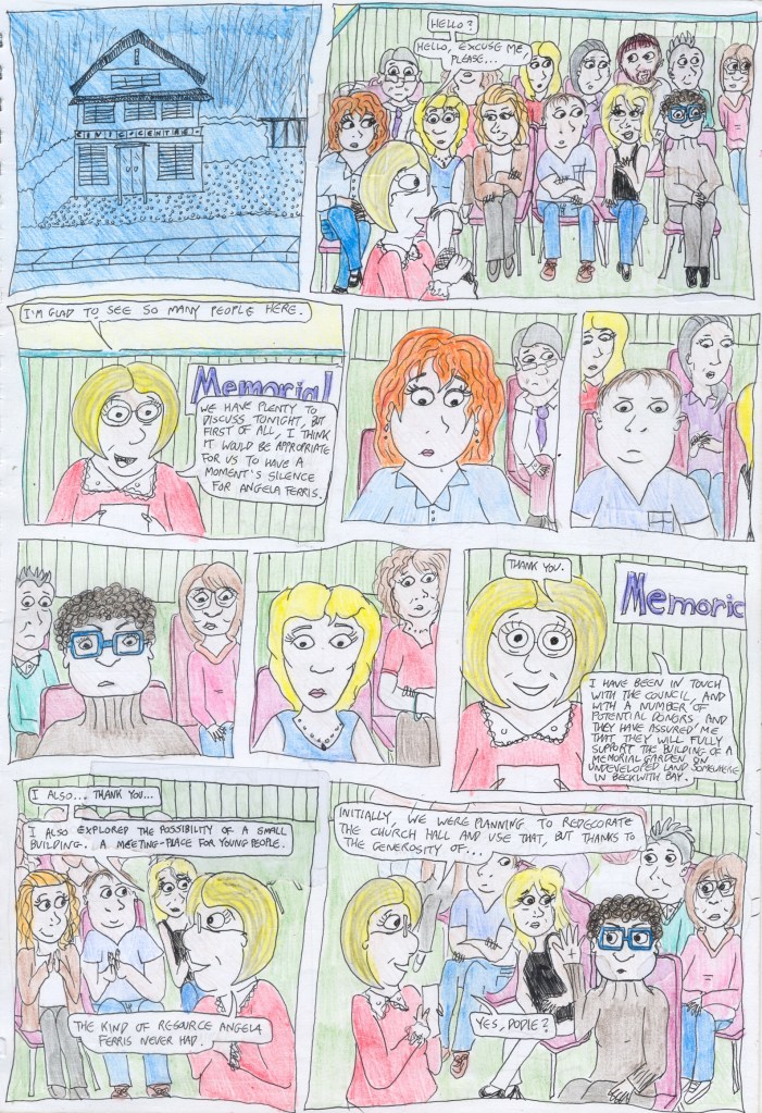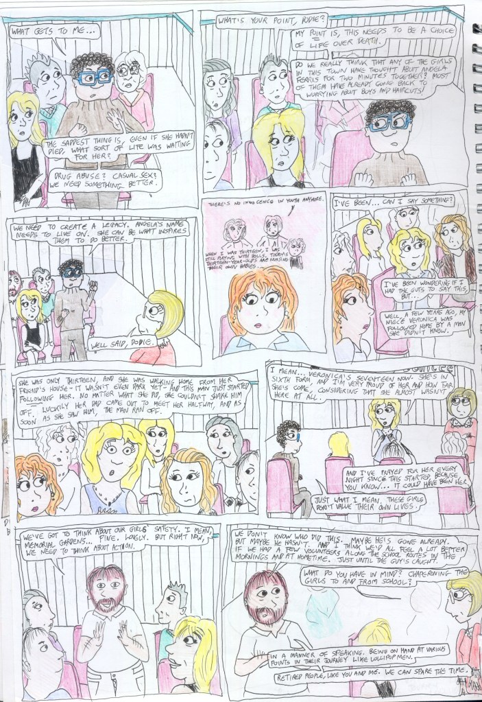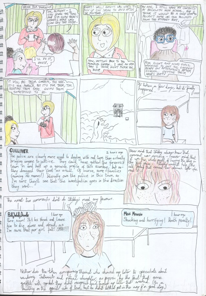 Right, this is getting ridiculous- it’s been two months since I promised to post the last four pages of Chapter One, and I’m nowhere near getting them properly coloured. Despite the fact that I’ve inked my way up to mid-Chapter Six and sketched my way up to the epilogue. So I’m going to post these in their current, half-coloured state so that I can draw a line under Chapter One, and then I can post the finished version later. Here we go!