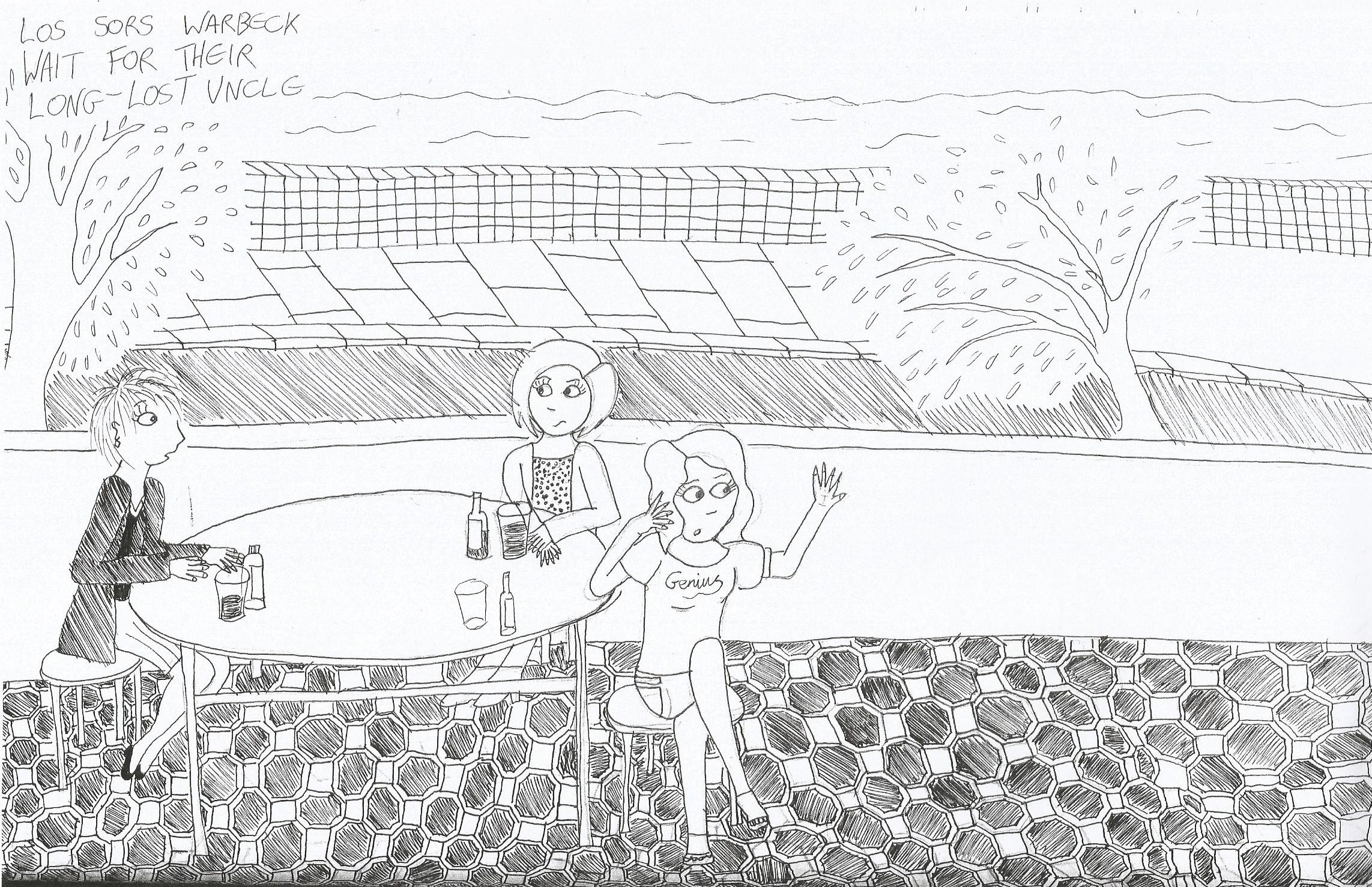 “I still don’t know why he couldn’t have met us at the station,” said Jeanette, shielding her eyes from the sun. They’d got to that stage in waiting where Jeanette suddenly forgot how to keep still. She’d been shifting about on her seat, playing with her empty drink bottle, and examining her nail varnish for any chips that might have appeared in the last thirty seconds. Sally didn’t know how long they’d been there exactly. All she knew was that it had been enough time for her to drink four bottles of Pepsi. If Mum had been there, she’d have made her stop at two, but she wasn’t, so Sally was going to make her own fun.