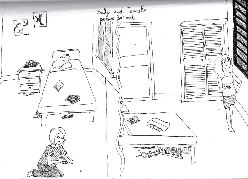 She’d been worried that she’d have to share with Sally. Even after they saw that there were enough rooms for the three of them, she’d worried that Sally might say she’d feel better with Jeanette or Rube in the same room as her. And Jeanette would have been the obvious choice, being three years older instead of five and a half, and she wouldn’t have been able to complain or refuse without feeling like a selfish jerk. Sally had been anxious about this whole trip from the start. If she’d needed her big sister to keep her company, then big sister would just have had to to swallow her desire for personal space and do the right thing. But it hadn’t happened. Sally was in the room next door, close enough to shout if she needed anything, and Jeanette was in here. It was the first stroke of luck she’d had all day.