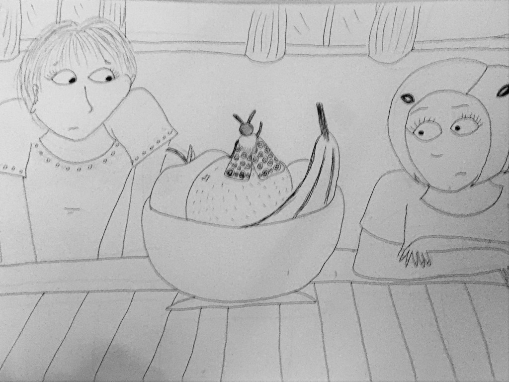 “Should be,” said the moth, “That staircase leads up to the Jackeries- the worst they’ll do there is try and feed her their casserole for hours. The last time Colwyn and me were up there, we had three or four families shoving plates in our faces. They just wouldn’t take ‘no’ for an answer.”